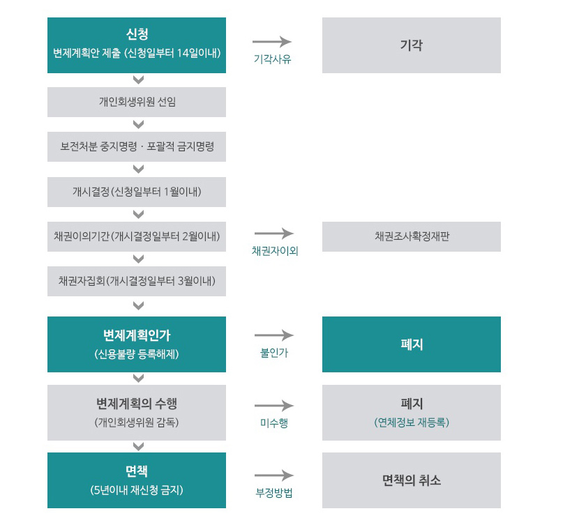 재정적 어려움으로 인하여 파탄에 직면하고 있는 개인채무자가 장래 계속적으로 또는 반복하여 수입을 얻을 가능성이 있을 시 자신의 상활에 따라서 3년 내지 5년의 기간 동안 가용소득을 생계비 제외하고 변제하면 면책 받을 수 있는 제도입니다.