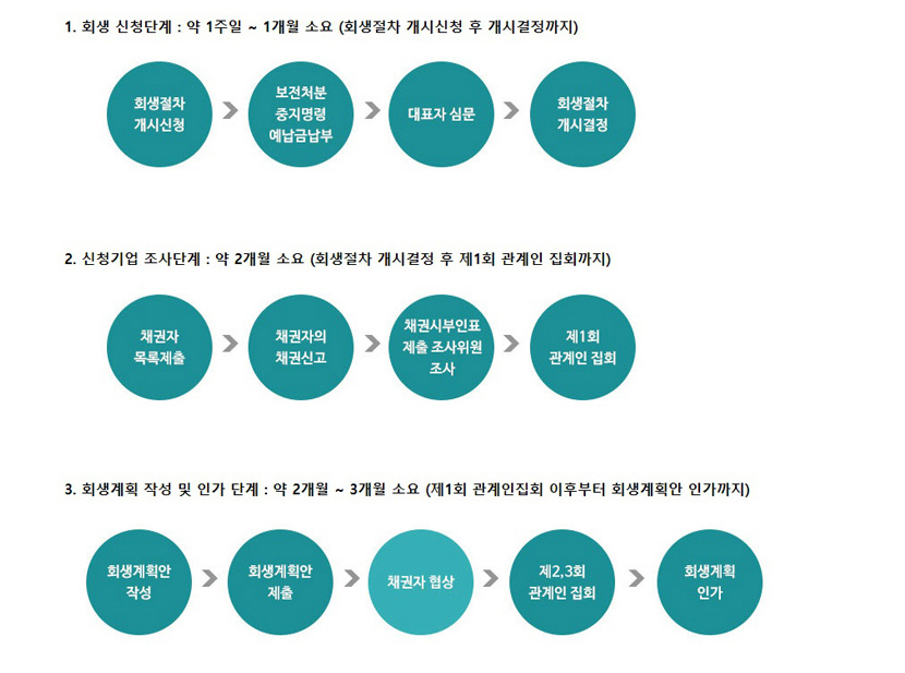 기업이 재정적 어려움으로 인해 파탄에 직면한 경우, 이해관계자(채권자, 주주,지분권자 등) 들과 협의 및 결의를 거쳐 인과된 회생계획안에 따라 지속적으로 사업을 영위하며 발생하는 수익 등으로 최장 10년간 채권자들에게 채무를 분할 변제하는 제도입니다